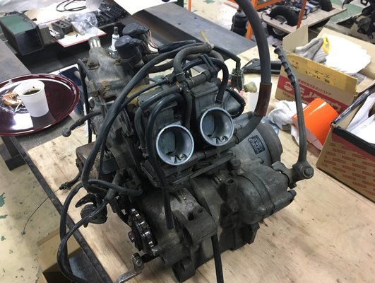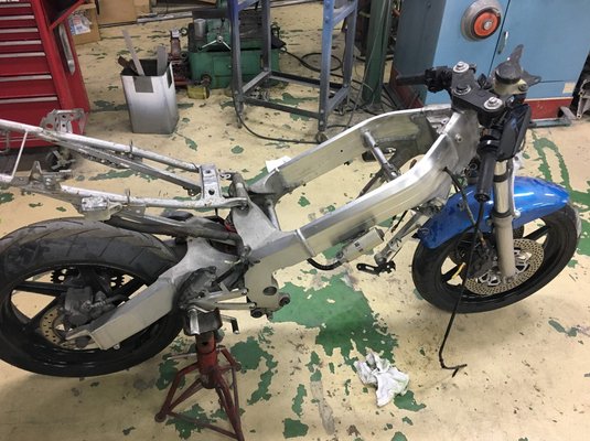 Egy pályamotor építését mindenki úgy kezdi, hogy apró darabokra szedi a gépet. Függetlenül attól, hogy teljesen új gépről van szó, vagy mint az én esetemben egy hulladékról. Ez volt a következő lépés. Maradék idomok le, blokkot ki, kábelköteg ki, futómű viszlát, mindent szépen átnéz. Amikor igazán szembesülsz azzal, hogy nagy a baj, az az a pont, amikor az alkatrészek, amiket levettél, és szeretnéd megtisztítani, a kezedben törnek darabokra. Minden, ami műanyag a motoron.