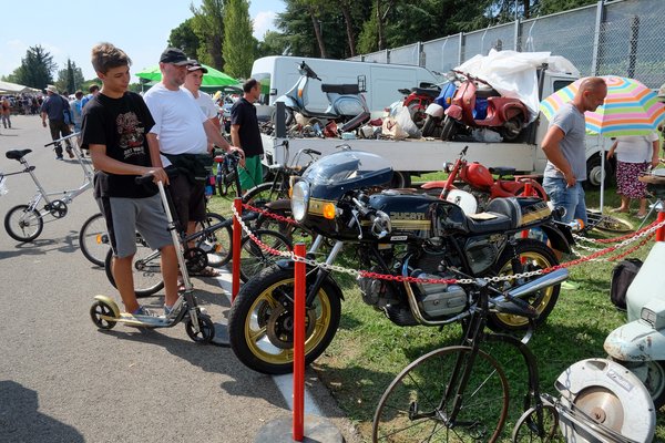 Ez, ez mennyi lehet, 125-ös, négyütemű? - sorolta, s már a nyergében is ült. Amikor megtudtuk, hogy 700 az ára, már szinte biztos voltam benne, hogy két motorral távozunk a börzéről. Diskurzusba elegyedtem az eladóval, amennyire már csak az én olaszommal diskurzusba lehet elegyedni, Mindenesetre nem a piramisok építéséről szóló, művészettörténeti doktori disszertációját vitattuk meg, inkább egyszerűbb témákat vettük elő, hiszen késő délutánra járt már az idő. Funzionante? - tettem fel papagájszerű szótáram egyik ütős kérdését, mire az olasz, akiről kiderült, hogy nálam jobban műveli a nyelvet, hosszú szóáradatba kezdett arról, hogy nemcsak hogy működik, de mechanikailag tökéletes, rendbe lett téve a motorja, fékje, mindene, így, ahogy van, azonnal Föld-körüli túrára lehet vele indulni, akár kint az orbitban. Legalábbis valami ilyet sikerült kihámoznom.