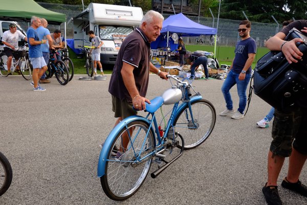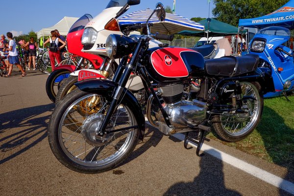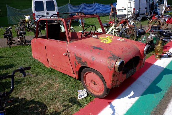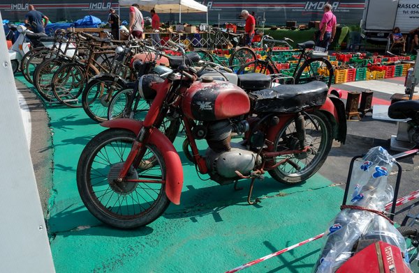 Onnantól Endre átváltott alvajáró üzemmódba, ja, erős volt a nap is, nem vitás. Én is tudtam volna szundítani egy órácskát, Endi pedig így is tett – ahol megálltunk a Bálinttal, ott mindig leheveredett az árnyékba, horpasztani. Elvégre az olaszoknál ilyenkor siesta van, láttam másokat is eldőlni mindenfelé, jó az a bioritmusnak. Mi pedig sokszor megálltunk. Volt ugyanis pár tétel a fiam listáján, amit mindenképpen ki szeretett volna pipálni Imolában. Amiben a leginkább reménykedhettünk, hogy találunk Gilera Giubileót (ugye, „dzsubileó”, mint jubileum), abból létezett 98-as és 125-ös egyaránt. Érdekes lehetett volna még a Ducati Diplomat, illetve a Moto Morini Corsaro 125-ös, utóbbiból inkább valami korábbi példány, mert a későbbiek nem valami esztétikusak.