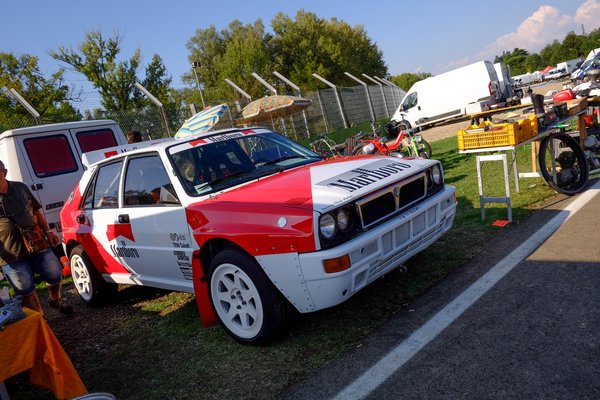 Csábos nyolcvanas évekbeli Ducatik, izgalmas autók – még egy Lancia Delta HF Integrale is, ablakában a versenyek listája, amiken indult az elmúlt harminc évben –, használt Boeing-kerék (hátha valakinek elkopott a csomagtartóban a pót), aztán ott állt csillogva, ordítva, pompázatosan, szoborszerű szépségében egy restaurált – Giubileo...