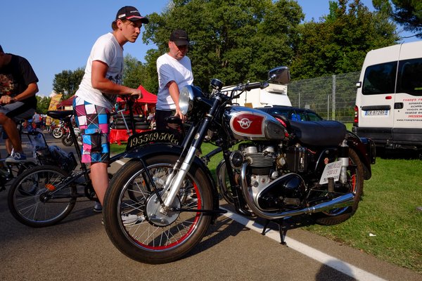 Bálint túljutott az újabb megpróbáltatáson, én következtem. Feltűnt ugyanis egy Matchless G9, ami az én AJS Model 20-asom testvértípusa, ugyanott, ugyanakkor, ugyanazokból az alkatrészekből készültek, olyanok, mint Subaru BRZ és Toyota GT86 párosa. És ez szép volt, de milyen szép. Még a felni közepén is megvolt a küllők gerince mentén a festés, ami az én AJS-emnek talán az egyetlen hiányossága – legalábbis azok közül, amiket addig kiszúrtam. Mennyi? 6800. Kezdőnek. Nem hangzik jól. Aztán ezt is jobban megnéztem. A kilométeróra valami házilag hajlított alumíniumkonzolon. A nyereg tömése csak nagyjából sikerült, AWAB-bilincsek itt-ott, lefestett, megrozsdásodott csavarok, hullámos króm a tankon. Ha nem vettem volna meg az AJS-t és itt lenne még a Dani, hogy ezt lenyomja 6000-re, talán ezt venném, mert olcsóbb.