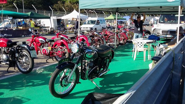 Ezzel meg is oldódott az összes imolai kínunk, mert nagyjából körbe is értünk a börzén. Még megnéztük a gyári, turbós Alfa 75-öst (15 ezer pénzért), ami azért elég masszív ritkaság, visszamentünk megnézni az én AJS-emet, amely megnyugtató derűvel és az angol motorokra jellemző, határtalanul önbizalommal teli pózban csillogott a lemenő nap sugaraiban, majd pokoli zaj szakította meg a szomszéd standról az elmélkedésünket.