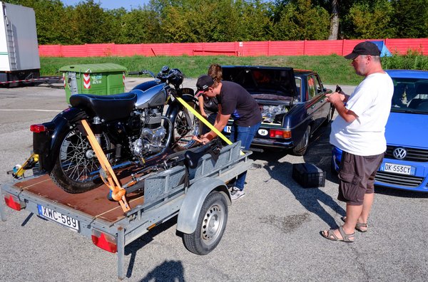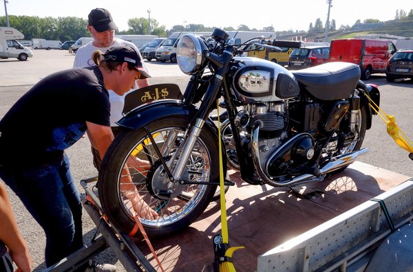 Az AJS-t felkötöttük Endre szomszédjának ATV-szállítójára, jó sok spaniferrel, mindenhová rongyokat tépve, ahol a heveder ledörzsölhette a festéket. Egészen szép szerelvényt hoztunk létre, némi elégedettséggel töltött el, hogy az egyik legstílusosabb fogattal tudtunk távozni a városból, kaptunk is feltartott hüvelykujjakat, szépen. Ezt így kell, ha van rá mód. Sokkal jobb az autónak is ez az életvitel, mintha otthon állna, vattába csomagolva.