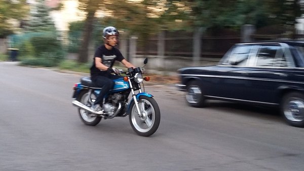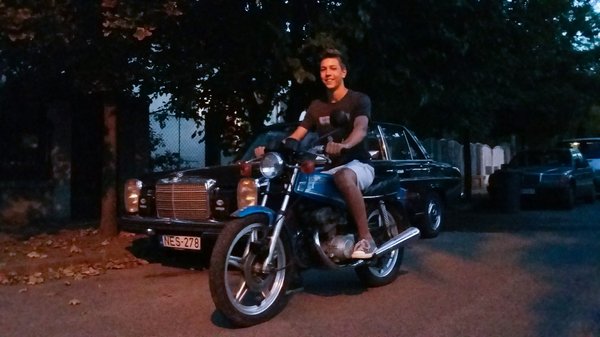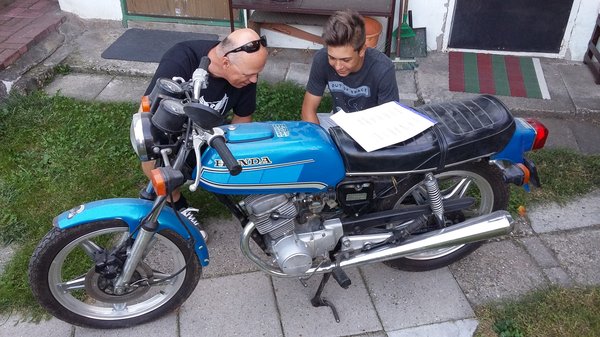 Nulla mechanikai zaj, egész jól veszi a lapot, bár fordulaton kicsit eldadogja magát. A jobb karburátorból ömlik a benzin, a tűszelep nyilván eddig bírta, majd szétszedjük, 1700 forint bele az új. Bálint euforikusan pattant nyeregbe, ez alkalommal még azt is elnéztem neki, hogy nem húzott bőrdzsekit. Hármasig felgangolt a ház előtt, hagytuk bemelegedni a motort. Tényleg szépen működik. Még a villamosság nagy része is tökéletes, csak a hátsó indexek nem működnek. Bálint végre járműtulajdonos lett.
