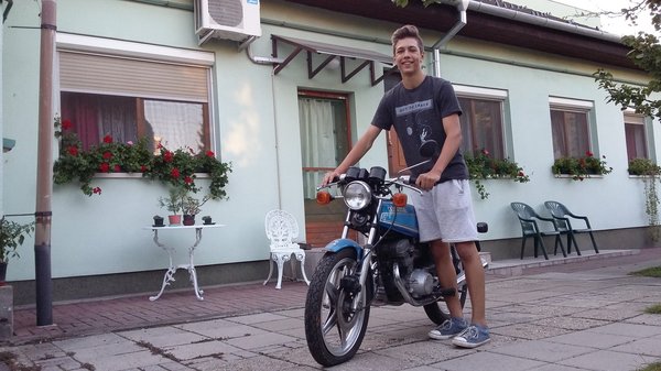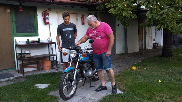 Másnapra, mire Bálint hazajött a suliból, már beindítottam a gépet. Szerencsére hatvoltos, ezért a Morini akkuja épp tökéletes volt neki. Lett gyújtás, majd némi gyertyapucolás, rugdalás, szívatózás, szellőztetés, megint rugdalás után már járt is. Nem is csúnyán.