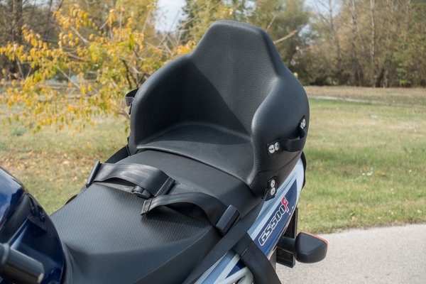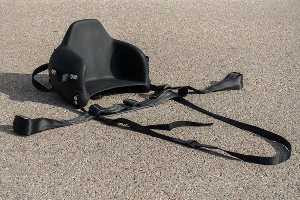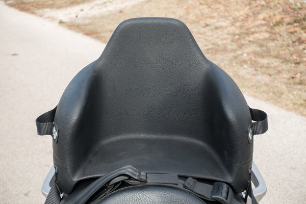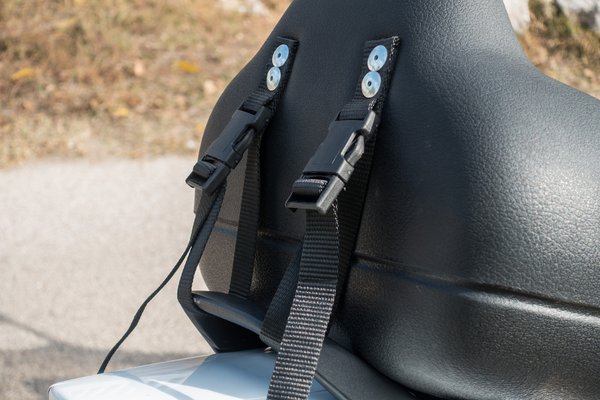 A lábtartó ugyanolyan sűrű szövésű, kemény szövetből van, mint az autók biztonsági öve. A pántok kisebbek és vékonyabbak, ennek ellenére legalább olyan masszívnak érződnek és semmi rugalmasságuk nincs. Maga az ülés egy puha, rugalmas műanyagból van, aminek az alját pont annyira ívelték meg, hogy minden ülésre tökéletesen ráüljön. A háttámla elég egyenes, és amikor a GS500-ra tettük fel, furcsán előre dőlt, ami eleinte nekem furcsa volt. Láttam benne ülni az öcsémet, de csak a Malagutin, ahol teljesen egyenes háttal ült, és nem panaszkodott, hogy kényelmetlen lenne.