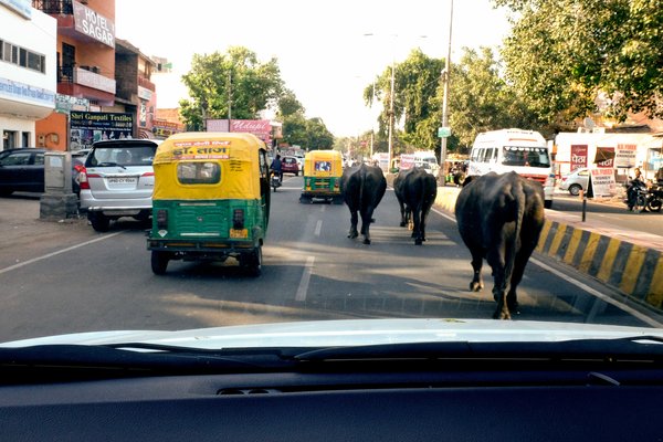 Más tuk-tukok, kerékpárok, motorok, robogók, személyautók, teherautók, buszok, kamionok, gyalogosok, gödrök, kátyúk, szörnyű (és gyakori) fekvőrendőrök, nyitott csatornák – no meg a kutyák, tehenek és bivalyok, ennyi a fő akadály a tuktuk-sofőr számára. A marhák nemcsak a városokban, de még az autópályák mentén is gond nélkül legelésznek, olykor csordában, a belső sávban. Elütni őket nem ajánlott, mert az indiainak a szarvasmarha szent állat, ami azt jelenti, hogy rugdalni, ütni, elkergetni, megfejni ugyan lehet, s ha megdöglik, a bőrét, csontját is lehet hasznosítani, de megölni, megenni abszolút tilos. Szóval a tuk-tukos számtalan mozgó, álló, látható és kevésbé észrevehető akadályt kerülget, közben egyben marad ő is, utasai is. A felelősségérzetével nyilván nincs baj, mert ilyen járműveket nemcsak taxiként használnak, felnőttek, hanem több család összedobja, amije van, hogy a csemetéiket csoportosan, afféle iskolabuszként hazahozza a suliból – baromi sok ilyet láttunk.