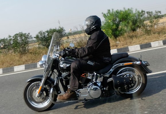 Viszonylag új Harleyk voltak, indiaias üzemmódban: vészvillogóval, kék lámpákkal felszerelve, de érdekes módon, mintha a többségüknek gyári lett volna a kipufogója. Abban a zajos országban... Képet nehéz volt lőni róluk a volán mögül (éppen eléggé elfoglalt a vezetés), de egy homályos fotó azért sikerült – a csávó egész más divat szerint öltözött, mint ami a világ többi részén a harleys dress-code: túrabakancs, barna öltönynadrág, kínai dzseki, felnyitható állú sisak. Ehhez képest én vagyok a Paco Rabanne a Ducatimon.