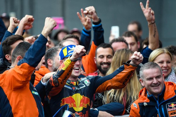 Említsük meg a történelem legfiatalabb GP győztesét, a török Can Öncüt, valamint Oliveira pazar feltámadását a Moto2-esek mezőnyében. Talán érzik a felvezetést, voltak jelek, melyek arra utaltak, ez bizony akár még a KTM nagy napja is lehet. Azt viszont senki nem remélte, hogy az osztrák gyár akár futamot is nyerhetne a királykategóriában, főleg, miután a leszakadó esőben Pol Espargaro bukott, és szinte a mezőny végéről kezdte meg felzárkózását. A futamot megszakították piros zászlóval, a mezőny pedig újra rajtolt, Espargaro pedig folytatta ádáz csatáját az ellenfelekkel és az időjárással.