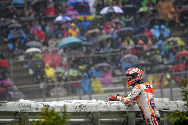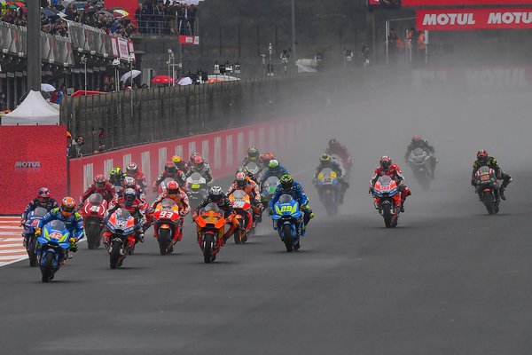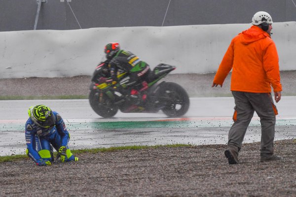 Néhány kör elteltével a körülmények tarthatatlanná váltak, a versenyzők pedig sorra estek. A legmeglepőbb mind közül talán a regnáló világbajnok, Marc Márquez volt, aki elrontotta a gumiválasztást, és medium hátsó abroncsot szereltett a motorjára. Márquez végül óriásit esett, és kiírta magát a küzdelemből. A nagy nevek közül őt követte Maverick Viñales, aki nagyjából száznyolcvanas tempónál mutatott be példás tornagyakorlatot a motor felett. Nagyjából mindenki láthatta, a verseny háromesélyes, ugyanis Dovizioso mellett Alex Rins és Valentino Rossi is bejelentkezett az első helyért.