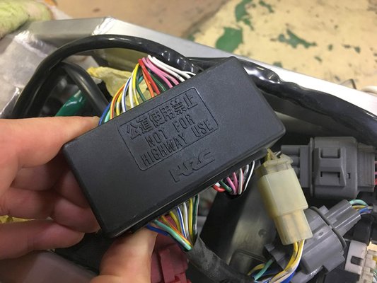 Elmesélem hátulról kezdve, a futóművet is onnan kezdtük. Szóval visszamegy az ECU. Szépen megtisztítva, gumibakon ágyazva. Erre felpattan a HRC box, ami azt hivatott szolgálni, hogy a leszedett cuccok visszajelzői ne csináljanak balhét, és a tiltás a felső három fokozatban ne lépjen életbe. Okosan ki vannak cserélve rajta a csatlakozók olyanra, hogy csak a gyári versenykötegre lehessen csatlakoztatni. Itt jön rögtön két dolog, amit nem tudtam, hogy szükségem lesz-e rá. Az egyik az akksi, a másik a feszültségszabályzó a töltéshez.