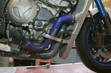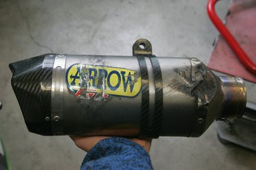 A HP4 kipufogója alapból titán, de ez az Arrow rendszer nagyságrendekkel csodálatosabb. Titánból készült, csodálatos réz csavarokkal, hogy ne rohadjanak össze. A sérült dobot Gépátvétel Gábor megpróbálta berendelni, de kiderült, hogy nincs benne az Arrow katalógusában, a pillekönnyű cső ügyében külön kellett írni a gyárnak. A különlegességéről rengeteg apróság árulkodik, például a hangtompító is egészen más, mint a nagyszériában gyártott titán doboké, sokkal igényesebb, kúpos kialakításáról és a kiköszörült hegesztéseiről ordít, hogy különös gondossággal készült.