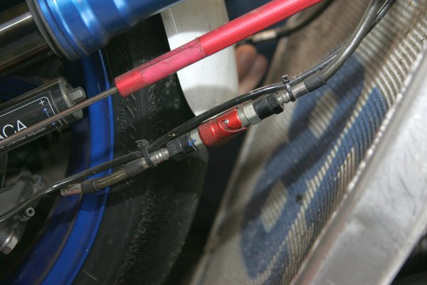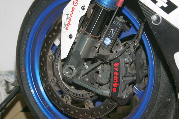 A Goodridge fém fékcső olyan elem, amit az utca motorosa is megengedhet magának, a fényereg felett látható gyorszárak viszont megintcsak méregdrága versenycuccok: ezekkel úgy lehet oldani és újra csatlakoztatni a féknyerget, hogy nem kell utána légteleníteni. Például ha a rajtrácson derül ki, hogy esős verseny lesz, villámgyorsan tudják cserélni a komplett kereket, illetve bármilyen szerelésnél hálás, ha kevesebbet kell csavarozni.