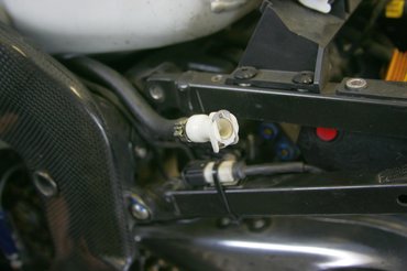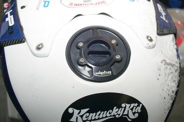 Érdekes apróság a benzincsőbe beiktatott T elágazás. Ez megint egy olyan apróság, aminek csak a versenysportban van értelme: a belső AC pumpás tankból így a legkönnyebb leengedni a benzint. Például így tudják visszaszámolni az elfogyasztott benzinmennyiséget, hogy az adott versenytávon mennyi a fogyasztás. Tehát edzés végén a leeresztett benzinmennyiségből vissza tudják számolni, hogy mennyi benzin fog kelleni a mondjuk 26 körös futamra. És miért nem rátankolással matekoznak? Mert tele tankkal rosszabb a motor kezelhetősége, tehát edzésen mennek 5 kört, teszemazt fél tankkal, megnézik, mennyi fogyott, aztán ha háromnegyed tank elég a versenyre, akkor nem tankolnak többet.