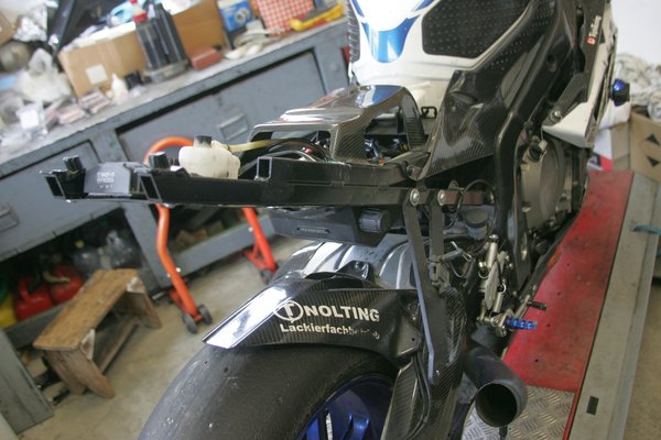 Ahhoz képest, hogy ez a motor ment a világbajnokságon is, meglepően sok része gyári. Erre az a magyarázat, hogy a Wilbers nagyon szorosan együttműködik a BMW-vel, lényegében gyári támogatást élvez a versenycsapatuk, például gyári alkatrészeket tulajdonképpen anyagáron vásárolnak. Ezért bizonyos esetekben olcsóbb és egyszerűbb volt megtartani gyári elemeket, például a tankot és a segédvázat - ennek a másik oldala, hogy a BMW támogatás miatt a szerződésük része, hogy a versenymotorjaiknak mindig újszerűnek kell látszania. Ők így fogják a költségeket.