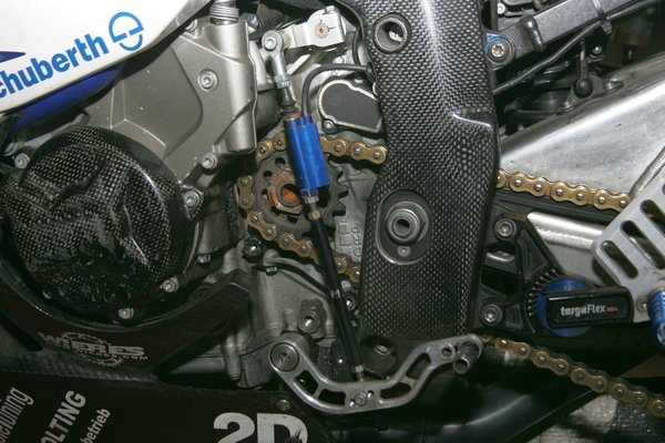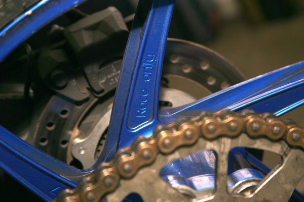 A hátsó lánckerék alumínium - megint súlycsökkentés egy forgó alkatrészen -, a lánc viszont nem versenylánc, csak egy erősített 520 DID. A komoly versenyláncokban ugyanis nincsenek gumigyűrűk, ezzel is csökkentve az ellenállásukat, ellene szól viszont, hogy rövidebb az élettartama és több törődést igényel.