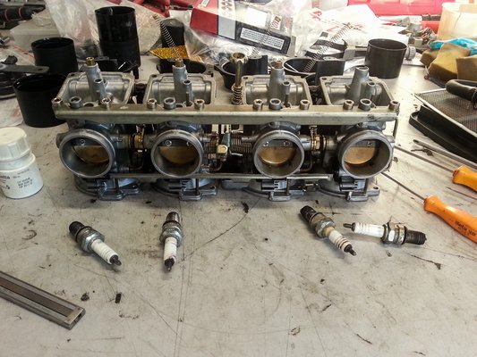 A gyertyák állapotából egyből kiderült, hogy az egyik hengernél valami nem stimmel – a karburátor pillangószelepe ott időnként felakadt, ezért túldúsítás nyomai látszódtak. Bár az elektródák még bőven jók voltak, a gyertyatesten lévő égésnyomok miatt nem is volt kérdés a csere – kerültek bele jó minőségű, Made in Japan NGK-k. A karburátoron látszódott, hogy ezzel valaki már foglalkozott. Eleve kevés volt benne a retek, jók voltak a tömítései, illetve 150-es Dynojet fúvókák voltak benne. Ami erős túlzás, ezt onnan tudom, hogy egy tuningolt Banditról írt posztnak a kapcsán jelentkezett Tibor, akiről két levélváltás után kiderült, hogy elképesztően nagy lég-olajos Suzuki-mániákus, és küldött egy irgalmatlan táblázatot az összes négyhengeres SACS blokkok minden adatával és a hozzájuk tartozó javasolt módosításokkal. És abból kiderült, hogy ehhez a 40-es karbihoz alaphelyzetben 125-ös fúvóka való.