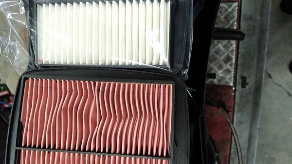 A Dynojet cuccok mellé rendeltünk egy halom tömítést, ugyanis a blokk tetején megjelentek olajszivárgások, illetve látszott, hogy az előző szerelőket a Loctite szponzorálta. Sejtettem, hogy lesznek rejtett aknák, de az azért meglepett, hogy Gábor szinte azonnal jelentkezett, hogy a légszűrőnél a lángfogórács kívül volt, mármint ahonnan a levegő befelé megy. Ezen annyira felháborodott, hogy csak röviden tért ki arra, mennyire szégyenletesen hitvány légszűrő volt benne – rendeltünk a helyére gyárit, valóban ég és föld a különbség.
