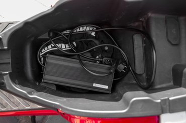 A fontos dolgokat megfelelő helyről rendelték, a 60V-os, 29 Ah-s akkupakk például a Panasonictól származik, és elvileg 70 kilométer tehető meg egy feltöltéssel, nekem a hűvös időben nagyjából 50-60 kilométert ígért. Ha ez valakinek kevés, vásárolhat még egy pakkot, amivel, ha az ülés alá betoljuk, megduplázható a hatótáv. Egy ilyen akkucsomag a beépített elektronikával nagyságrendileg félmillió forint, erre az importőr is azt mondja: ha kell a nagyobb hatótáv, jobban megéri az erősebb modellt választani, amelyben alapból két, nagyobb kapacitású akkumulátor van, miközben árban ugyanott tartunk. Az akkumulátor egyébként hiba esetén cellánként javítható, amelyek darabja minőségtől függően 600 és 2000 forint között mozog.