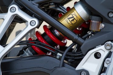 Az első teleszkóp nem állítható, az elektronikus futómű (Dynamic ESA) csak a hátulját tekergeti. Mégis kár lenne kihagyni az extrák közül, ha sokszor van utas a hátad mögött vagy szállítasz csomagot. A szintén opciós kulcs nélküli indítást is könnyű megszeretni, a led fényszórónál (plusz led indexek, menetfény) hatékonyabbal pedig még nem találkoztam motoron. Bár a gyári plexi eléggé alacsony, a felsőtest kellően védve van a széltől, és egyeltalán nem cibálják a sisakot zavaró légörvények.