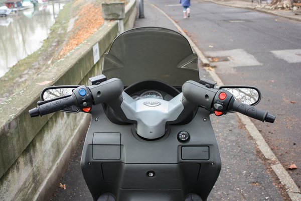 Városban viszont néha önkéntelenül is egyenes háttal ráfekszek a kormányra és lámpától lámpáig előzgetem az autósorokat, ami azért nem egyszerű, mert a motor elképesztően széles. A tükröket ritka-kretén helyre tették, mert egyrészt a motort is szélesíti, másrészt nehéz úgy beállítani, hogy ne a kezemet lássam. Sokszor hajolgatni kell, kutatni a képet a tükörben, és addig sem az utat figyeli az ember. Elég nehéz megszokni, viszont szerencsére a második generáción már feltették a tükröket a kormányra.