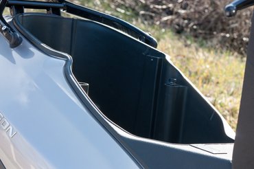Elég sok hely van benne, ahova pakolhatunk cuccokat, ez alkalmassá teszi a túrázásra. Az ülés alatti tároló hatalmas, amibe tényleg rengeteg apróság belefér, de elég furcsán van kialakítva, mert például egy átlag 16 collos laptopot sehogy nem tudtam belefűzni. Két sisak is csak első ránézésre fér bele, mert ugyan kényelmesen bele lehet tenni, de lecsukni az ülést már nem feltétlen. Szerintem inkább egy gyerek és egy felnőtt sisak elrejtésére lehet alkalmas.