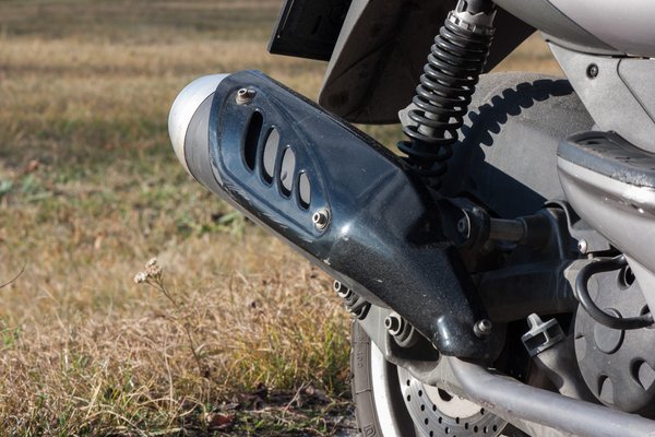 A kipufogódob elég nagy, és finoman, csendesen szól. Egy kicsit viszont mégis trükköztek, azért, hogy gázadáskor legyen egy ilyen férfias egyhengeres mély kopogása. A könyökcsövön a dob előtt, alulra fúrtak egy apró lyukat, amit ha ledugózok, ugyanolyan kávédaráló hangja van mint a többieknek. Ha mégis szabadon hagyjuk, mély, morgó hangon szól gázadásra, ami alapjáraton, vagy utazó sebességnél kis gáz visszaengedésre ugyanúgy eltűnik. Parkolóházban vagy aluljáróban könnyen elfeledteti velünk, hogy 125-ös.
