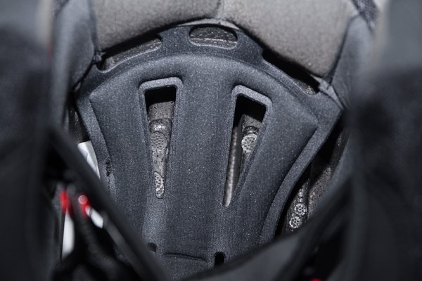 A bélés egyébként sittes, a tapintása kellemetlen, olcsó sisakokra jellemző anyagból van, ráadásul olyan, mint a jó bor, kibontás után érdemes levegőztetni, mert nagyon erős ragasztószaga van. Belenézve elsőre rémisztő, hogy a fej tetejére csak egy kis darab szövet jutott, alatta egyből az ütéselnyelő réteg látszik, de csak mert a célközönség jó eséllyel nem tudja, hogy kimondottan drága versenysisakoknál is látni hasonlót.