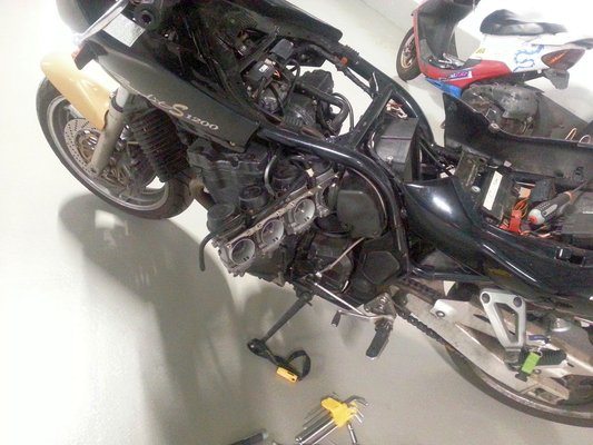 A tank levételéhez az oldalidomokat sem kell teljesen lebontani, elég csak félrehajtani őket, elég rugalmasak ahhoz, hogy ezt még bírják. Ha lent van a tank, le kell oldani a szívócsonkok bilincseit, lehúzni a karbit, majd a légszűrőház fedelét levéve az egészet kibillenteni - és úgy óvatosan játszva ki lehet húzni oldalra a karbisort. Hogy kevesebb legyen az elrontható munkafázis, úgy döntöttem,nem veszem ki teljesen karbikat, hanem csak addig tolom ki oldalra, amennyire a benzicsövek és a szivatóbovden engedik.
