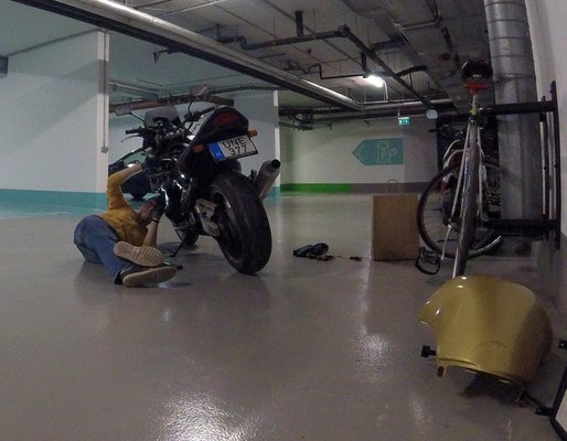 Utálok rosszul megvilágított garázsban a földön fetrengve szerelni, azzal nyugtattam magam, hogy ez egy profi műhelyben is pepecs meló lenne. Természetes fény híján el is veszítettem az időérzékemet, úgy jártam, mint egyszeri ausztrál turista a La Paz-i Ruta36-ban, csak kokó és zene nélkül. Ekkor még ment a GoPro, így tudom, hogy körülbelül 25 percet vett el, mire sikerült helyesen beakasztanom a karbiba a kis pöcköt.
