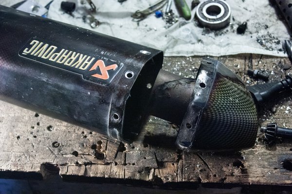 Meglepően jól lemásolták az eredeti Akrapovic kipufogó méreteit és arányait, inkább az összeszerelés minősége problémás. A hegesztésekkel spóroltak, az illesztések se nagyon passzolnak, és az anyag sem olyan vastag, mint az eredeti Akrapovicoknál. Mivel jók az arányok és a méretek, így akár még némi teljesítménynövekedést is okozhatna nagy fordulaton, de szakember legyen a talpán, aki ezt észreveszi menet közben. Az egyetlen gond, hogy járó motornál, orrán-száján ömlik belőle a kipufogógáz, ami máris elrontja az arányokat.