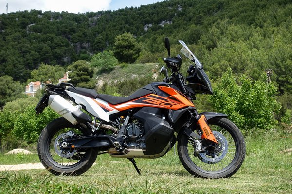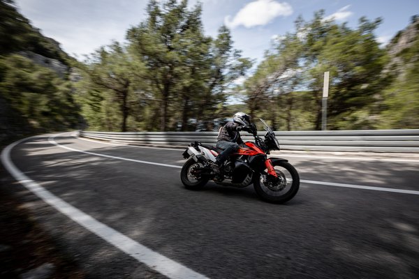 A soros kéthengerest a 790 Duke-hoz képest áthangolták, az Adventure-ben 95 lóerőt (8000-nél) és 89 Nm-t (6600-nál) tud, és egészen 7000-ig mindenhol nyomatékosabb, mint a naked változat, a Duke plusz tíz lóereje igazából csak 8000-es fordulat felett érvényesül. Bár a két henger párhuzamosan áll egymás mellett, a hajtókarokat elékelték 75 fokkal, így 435 fokonként van gyújtás, éppen úgy, mint egy V2-esnél - ennek nem csak a hang miatt van jelentősége, nem véletlen, hogy a BMW-től a Yamaháig mindenki átállt erre. Igazából nem is az egyenletesebb nyomatékleadás miatt szeretik, hanem a külön mozgó dugattyúkkal rengeteg súlyt lehet lefaragni, könnyebb lehet a főtengely, kisebb kiegyenlítősúlyokra van szükség.