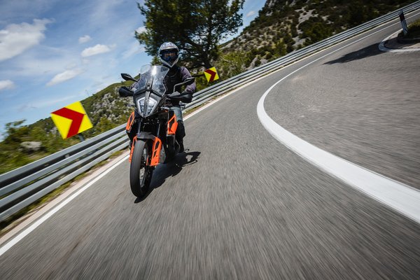 A 790-es blokk betyáros megindulásokra képes, közel másfélszer ilyen erős motorral járok dolgozni, de ez már lentről olyan hirtelenséggel meglódul, hogy őszintén meglepett az első nagyobb gázadásnál. A másik döbbenetet a hang jelentette, mármint hogy mindeközben mennyire nincs neki - miközben a 790 Duke gyári dobbal is elfogadhatóan trombitált, az Adventure-nél sztetoszkóppal kell keresni a hangot, és a helyzeten az Akrapovic kipufogó sem változtat érdemben.