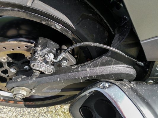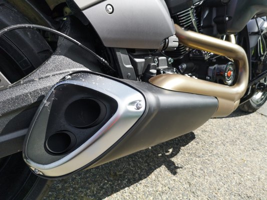 A kipufogó leömlője is úgy kanyarog, mint valami élőlény, vagy belső szerv, hogy aztán egy ugyancsak organikus bödönben végződjön. Na ez az, ahol talán tényleg sok egy kicsit a bátorságból: a Harley kipufogói mindig is csövek voltak. Vékonyabb csövek vagy vastagabb csövek, esetleg is, nem tudom, hogyan fog ez kinézni, ha majd kijavítja valaki. Tippem persze van, a világ egyik legjobb átépítője, a német Thunderbike már készített belőle egy elég szép dolgozatot.