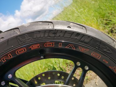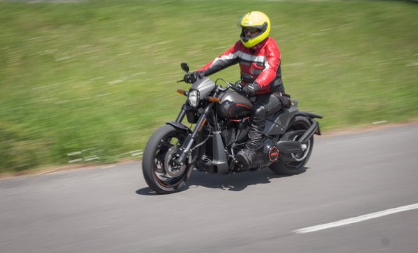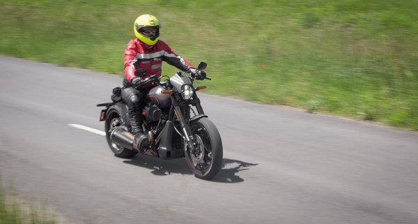 Most nagy divat a bumszli bobber-gumi, de az FXDR sportos, alacsony profilú gumikat kapott, hátul 240 milliméter széleset, per 40. Hát ugye, a drag-célú felhasználás... Próbáltam vele kanyarogni, de nekem valahogy nem adja ki. Talán többet kéne széles hátsó gumis, hosszabb motorokkal szerentineznem. A sportos gumi miatt viszont a fékhatás mind elöl, mind hátul sokkal jobb, mint az én bobber-úszógumijaimmal. Ráadásul az FXDR – ahogy (az új) Breakout és a Fat Bob is – elöl fordított Showa teleszkópokon fut. A kormánya is valami spéci alumínium öntvény lehet, két külön darabból a villaszárakra csavarozva. Bezzeg a Breakout: annak maga a Harley hívjadrag bar-nak a kormányát.
