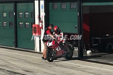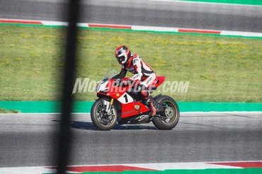 A tetőtől talpig Ducati cuccokba öltözött pilóta sem véletlen, óvatos jelzése annak, hogy hivatalos Ducati tesztről van szó, illetve a fényezésen kívül feltűnő még, hogy Öhlins futómű van a motor alatt (azt viszont nem tudom megmondani, hogy hagyományos, vagy félaktív), illetve a felnik is magnéziumból készültek, és mintha a szélvédő is magasabb lenne a szériánál.