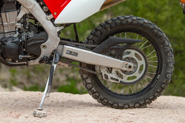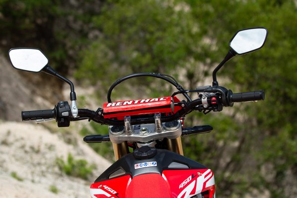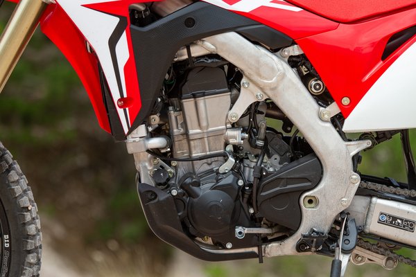 Miért is tűnne fel, ez lényegében egy pár évvel ezelőtti CRF450X lebutított változata, a lebutítás pedig a nem látható részeken történt. Más a vezérlés, az elektronika, nehezebb a főtengely, visszavettek a kompresszióból (12:1 lett a 13,5:1-ből), átdolgozták a légszűrőházat, és a kipufogó is egy lefojtott darab, akkora a végén a lyuk, mint egy 250-esen. És van még katalizátor, szekunder légrendszer, két oxigénszenzor, csak hogy valahogy kordában tartsák az égéstermékeket. Ezzel meg is van, hogy hová lettek a lovak – feláldozták őket a környezetvédelmi normáknak.