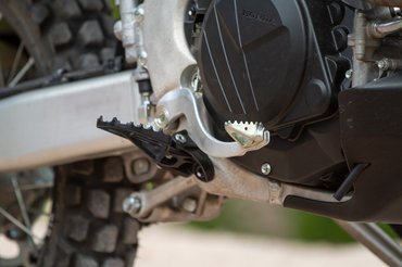 A terepes ügyesség záloga, hogy a vázhoz nem nyúltak, az egy az egyben jön a sportcélú CRF-ekről, az idomzat pedig valóban sportendurós – karcsú, nem akadályozza a mozgást, nem akad el a térd a hűtőt védő idomokban, az ülés rücsis bevonatán pedig nem csúszkál a fenék, terepen ezek fontos értékek. A nyers versenymotor hegyes viselkedéséből apróságokkal vettek vissza, a tengelytávba például beletoldottak 18 millimétert, hogy nyugodtabb legyen, illetve menesztőgumikkal csillapították a lánc rángatásait. Szintén a használhatóság jegyében az eredetileg 6,3 literes tankot 7,6 literre növelték – és ha már komfort, a lecsavarós-elhagyós tanksapka kapott egy zsanért.