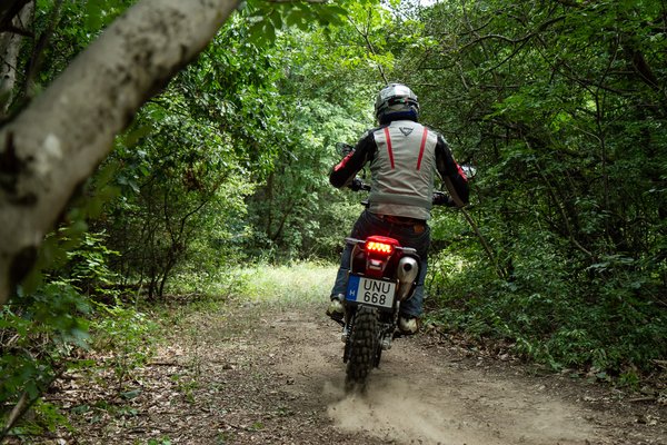 Alapból bizakodásra ad okot, hogy már csak a vezető súlyától nem ül össze a hátulja, mint a CRF250 Rally-nak, amivel – ugratónak nem nevezném, szóval – egy kis buckáról elpattintva is úgy lekoppant mindene, hogy még másnap is sajgott a csuklóm. A hangolása a krosszmotoroknál lágyabb, nem kell, hogy húszméteres ugratásokat elviseljen, cserébe erdőben sem pattog össze-vissza. Lehet neki tolni, a szoftenduróknál keményebb alapbeállítás bírja a terhelést. Ha a teljes rugóút legelején lágyabb lenne, érzékibben venné fel a köveket, rumplikat, és hatékonyabb lenne a gyorsítás. A göröngyös, technikás részeken, amikor teljesen futóműből mész, és úgy tudsz tempót felépíteni, ha a kerekek a talajon maradnak, olyankor egy lágyabban induló gátló nagyobb biztonságot ad – máshogy mondva: gyorsabb lehetsz.