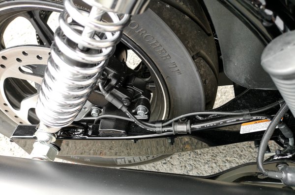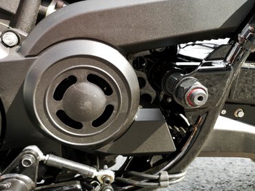 53 ló@8000, ez tényleg már a postás-MZ kategória. A Suzuki Gladius szintén vizes V2-ese 10 éve 650 köbcentivel volt 75 ló, de nem is a számai miatt volt jó, hanem mert egy erős motornak éreztem. Amivel jó volt menni, még akkor is, ha tudtam, hogy néz ki, és miből van a nagy része. A Street 750 viszont gyenge, a blokk nem rázkódik, nem harákol, semmi harleysat nem csinál. Bármi lehetne. De tényleg nagyon széles értelemben vett bármi, leszámítva értelemszerűen a Harleyt, mert az nem. A fogazottszíj-hajtás ugyanakkor Harley-dolog, csak hát érzésre azt nem érezni, látványelemként is csak akkor van meg, ha odanyomjuk a fejünket a nyereghez, és bekukucskálunk. Akkor meg muszáj lesz ránéznünk az iszonyatosan igénytelen lengővillára.