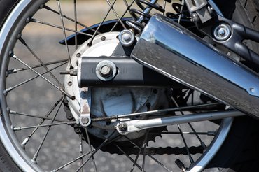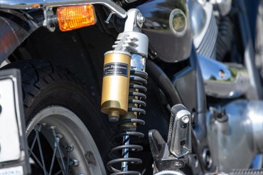 Közelről sem hangol le igénytelenségekkel, mármint azon felül, amit a tizenpár évnyi magyarországi szolgasor okozott, például a gagyi kínai irányjelzők a krómozott gyáriak helyett, vagy a duct tape-pel javított hátsó sárvédő. Szépek a szelepfedelek, jó formájúak a tükrök, mesteri a kipufogó csöveinek az íve, a láncvédő fémből készült, aranyos a benzincsap, a hátsó gátló pedig várakozáson felüli: progresszív rugó, állítható előfeszítés és csillapítás.