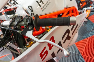 A MAMI-nak jelenleg 10 ilyen MIR-je van, és mivel csak másfél hete vették át őket, első körben csak a kormánycsövet alakították át. Az egy henger miatt erős a vibráció - ne feledjük, ez versenymotor, míg az utcai CBF250 elég kényelmes, ennél ez egyáltalán nem volt szempont, tehát a vibráció is sokkal direktebb. A gyári csutkák alumíniumból készültek, és nem volt olyan végsúly, amit bele tudtak volna szerelni - a kormányvégsúly lényege, hogy egy tehetetlen tömegként megfogja a vibrációt. Az alumínium amúgy sem bírja annyira a fárasztó igénybevételt, úgyhogy Zsombor úgy volt vele, hogy nem is mer bele megfelelő méretű súlyt rakni, inkább tervez egy jobbat, nehogy fáradásos törés legyen a vége. Úgyhogy fogtak egy varrat nélküli, elég jó minőségű 22x2-es csövet, méretre vágták, aztán megtervezték és legyártatták hozzá a befogókat. A kormányvégsúly belóg befelé vagy hat centit, elég nagy felfekvése. Illetve gyártottak hozzá fékkarvédőt.