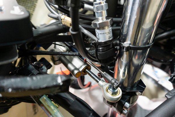 A Ninjákon már fent van a kormányelfordulás-szenzor, amelyet a kormánygátlóra házasítottak rá (szintén utólagos extra), és a blokk körül is sok meló volt, a szekunder légrendszertől a karbonkaniszterig semmit nem hagytak érintetlenül.