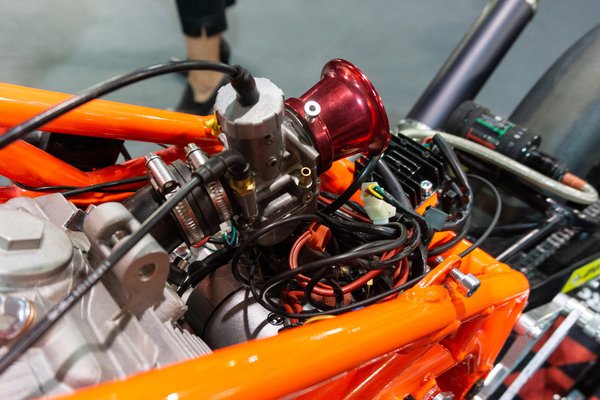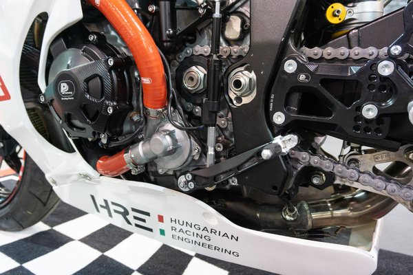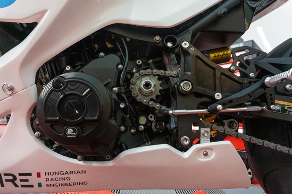 Ebben már benne van a teljes telemetria, került rá egy Bódis rendszer, de maga a motor teljesen gyári. Volt benne egy power commander, de megdöglött, tettek bele egy másikat, ami szintén nem volt problémamentes, szóval kidobták, és most széria blokkal mennek. A szekunder légrendszertől ennél is megváltak, ennek lényege, hogy a lambda miatt friss levegőt kever a kipufogógázhoz. Mivel lényegében a hengerfejbe adja a friss levegőt, tehát a hengerfej öntvénybe a kipufogó leömlőnél, ahol simán van 700 fok, vagyis ha van egy kis elégetlen benzinpára, akkor az azonnal utánégésbe kezd, és emiatt jobban melegszik a motor. A gyártó ezt így tervezi, a hűtőrendszer is így van méretezve, de amikor egy motor versenymotor lesz, akkor a cél, hogy minél hidegebben járjon, és ezzel nyernek hőmérsékletet lefelé.