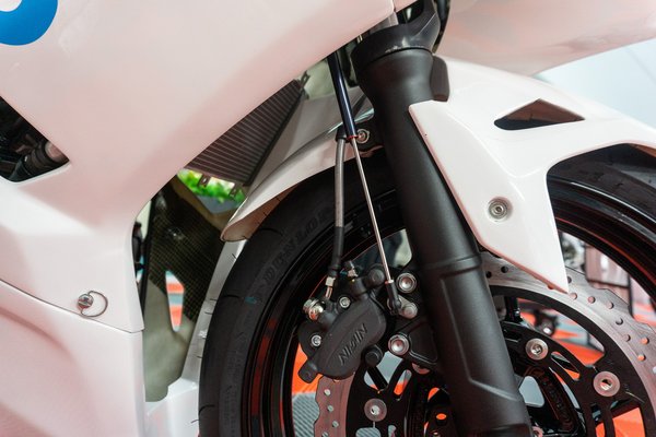 A központi rugóstag Öhlins, ez a legjobb, ami ide megvehető - az olasz Andreanitól rendelték meg, ráadásul úgy, hogy ugyanazokból a komponensekből álljon, mint amit a VB élmenői is használnak. Az Öhlins egyébként ebbe a SSP300-as kategóriába nem árulja a csúcs futóműveit, tehát a lakosságilag megvehető legjobb gátló, a TTX nincs ebben a méretben, csak az eggyel szerényebb, utcai sportváltozat. Ugyanez igaz az első villára is, Ninja 400-hoz nincs FKR cartridge, csak az egyszerűbb FKS - ezért az első futómű belseje nem Öhlins, hanem egy másik, de hasonló rendszerű - felépítésében és méretezésében ugyanaz, némi rosszindulattal nevezhetjük koppintásnak is, annyi a különbség, hogy minden alkatrész le van eloxálva, így kevesebb kopadék képződik, és nem kell olyan sűrűn olajat cserélni benne.