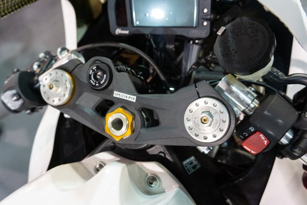 A hátsó féknél két cső van - az egyik a fékcső, a kék pedig egy nyomásmérőhöz megy, ami aztán továbbítja az adatot a műszerfalnak. Itt is a teljes telemetria a cél - az adatelemzés nagyon fontos a versenymérnöki oktatáshoz, a MotoGP-ben is minden pilótának külön telemetriás embere van, ami egy nagyon fontos és megbecsült pozíció a csapaton belül, neki kell ugyanis átlátnia és értelmeznie az adatokat, konzultálnia a versenyzővel, levonni a konklúziót és meghozni a döntést, hogy mit és merre kell állítani. És aki ezt tényleg tudja, az kincset ér. Általánosságban elmondható, hogy egy modern versenymotor rendkívül komplex rendszer, csak hogy egy példát mondjak, kanyarról kanyarra lehet beállításokat megadni az elektronikának, de például egy MotoGP motor váltójához egy külön oda rendelt mérnökre van szükség, aki semmi mással nem foglalkozik - tehát sok, egyenként is nagyon bonyolult részterület van, amik ráadásul elég nagy hatással vannak egymásra.