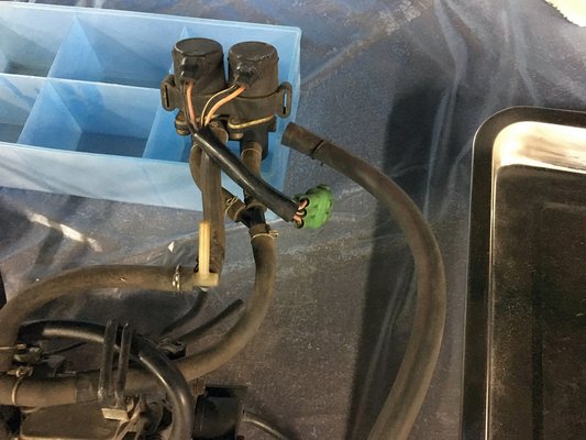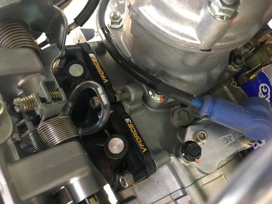 Arról a pontról indultam, amiről eddig minden alkatrésszel: baszki, hogy néz ki ez a nyomorult ennyi idő után. Ennek sem volt gazdája. Levettem őket, először együtt az elektronikusan vezérelt levegő szolenoid szelepekkel. Trükkösnek hangzik, de nem túl bonyolultak. Kettő van belőlük. Az elektromos Power Jetes karbikkal szemben itt nem extra üzemanyag jut a rendszerbe, hanem levegő. A szelepek miután csatlakoznak a karbikhoz, a belső járatokon keresztül a keverőcsőhöz vezetnek. Két vezérlési paraméterük van, az egyik a gázállás függvényében nyit, a másikat pedig az aktuális fordulatszám értékhez képest működteti az elektronika. Ezek csatlakoznak egy csőkígyóhoz, aminek kettő érdekes darabja van, amiket ráadásul nagyon nehéz is volt találni HRC verzióban.