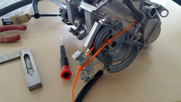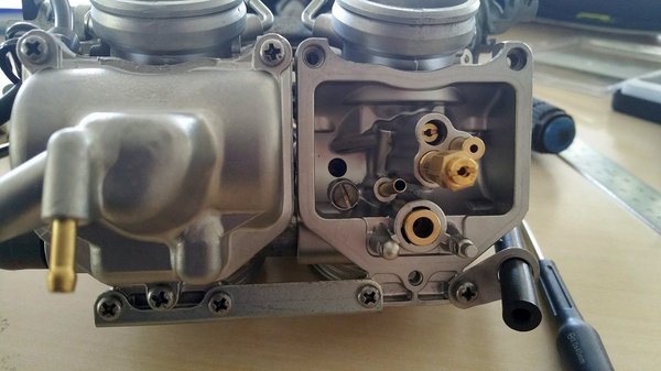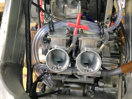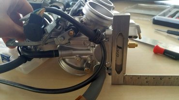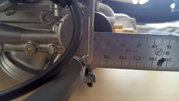 Az utolsó nagyon fontos paraméter. Enélkül kár is bármit megcsinálni, amit idáig leírtam, mert SOHA nem fog működni a karburálásunk. Az úszószint. Még az úszóház visszatétele előtt, az úszóház felfekvő felületére merőlegesen le kell támasztani a karbikat. Ebben a pozícióban, mérjük az előbb említett felülethez az úszó szintet. 13mm körül van az arany középút, de a 12,5–13,5 mm tartományon kívül tuti vakvágány. Ezután mehet vissza az úszóház. A lekötött olajszivattyú bemeneti csonkokat szépen egymásba kötöttem egy középen vakdugóvá alakított csővel. A szinkronhoz van 1-1 pötty a síktolattyúkon a hozzávetőleges szemre belövéshez, aztán, majd ha már jár a kicsike, megvannak a bemenetek a szívótorkon a mérőóráknak. A teljes levegőkorrekciós rendszer csövezését új, átlátszó szilikon csövekre cseréltem végül, és ezzel, amíg nem jár a gép, a karbi le is van tudva.