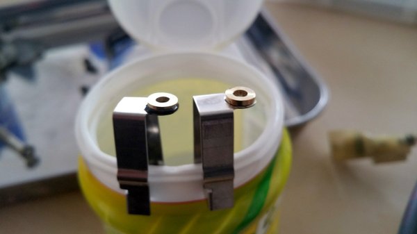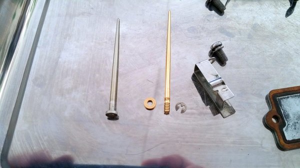 A tűnél kellett egy számomra erősen tákolásnak számító módosítást végeznem. Egész pontosan nem is a tűn, hanem a tűt rögzítő rugón. Mennyire utálom én azt a rugót. Jó, ha három kezed van, ha ki akarod venni, annyira túl van biztosítva a geometriai zárás rajta. Mivel a gyári tű feje egy vaskos kis henger, ugyanis nincsenek rajta hornyok, ennek a kis hengernek van süllyesztése a karburátor öntvényben. Ha ezek után a seeger gyűrűs tűt csak simán beraknánk ide, akkor a tű el tudna "lebegni", azaz nem lenne leszorítva teljesen. Ennek a megoldására jött az átalakító készletemben egy réz alátét, amit rá kell ragasztani a gyári rugóra, így lesz kihézagolva az új tű. Mondom, hogy erősen tákolós. Annyival tudtam nyugtatni a lelkem, hogy a műhely legerősebb kétkomponensű, hőálló ragasztójával követtem el. Állítólag a mindenki fejében élő japán kapukat, a "torii"-kat (鳥居) is, amik a földi világ és a másvilág közti átjárást szimbolizálják, ilyennel ragasztották, aztán láss csodát, még az atombomba után is állt egy-kettő.