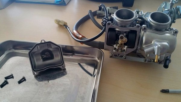 Kezdésként szépen fogtam és egy gyorskötözővel kiakasztottam a fojtószelep tengelyt nyélgáz állásban. Ez azért jó ötlet, mert a tű kiszedéséhez csak ebben a pozícióban férünk hozzá a tűt rögzítő rugóhoz. Ide mindjárt visszatérünk. Egyesével levettem az úszóházakat. Úszó, úszótűszelep, és annak az üléke is cserés volt. Szépen bevarrtam a fagyóba az újat, és máris egyszerű volt bepréselni. Az úszót ellenőriztem, nem lyukas, folyik be, a tengelyét szépen megsimogattam polírpasztával. Gyerünk tovább a fúvókázáshoz, annak gázállás szerinti relevanciája alapján.